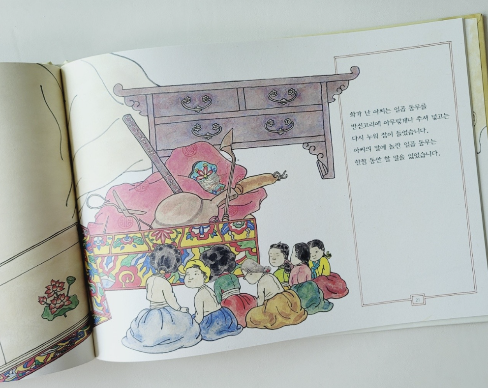 고전 수필 '규중칠우쟁론기'를 어린이 그림책으로 재구성한 책입니다. 바느질을 좋아하는 빨간 두건 아씨와 자, 가위, 바늘, 실, 골무, 인두, 다리미가 서로 자기 역할이 최고라고 다툽니다. 결국에는 모두가 서로 도와야만 바느질이 이루어짐을 깨닫는 이야기입니다. 우리 고전을 되살려 그림책으로 만든 기획과 정감 있는 그림이 돋보입니다.