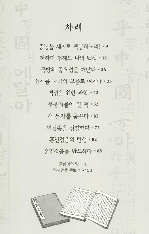 백성을 위해 일생을 바친 성군 세종의 일생과 그가 남긴 위대한 유산 '한글'이 탄생한 배경을 담고 있는 책입니다. 아이들의 눈높이에 맞춘 간결한 호흡과 풍성한 이야기로 세종대황의 일생을 풀어내고 있습니다. 책벌레 세자 이도가 우리 역사 최고의 임금인 세종대왕이 되기까지의 여정을 쉽고 재미있게 짚어 주는 책입니다.