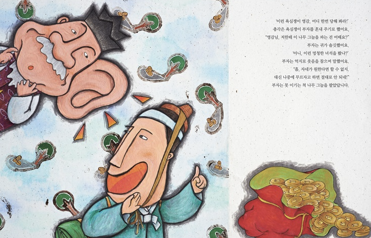 부자 영감이 나무 그늘에서 낮잠을 자고 있는 총각을 내쫓으려다 총각의 잔꾀에 넘어가 도리어 골탕을 먹게 되는 이야기입니다.
