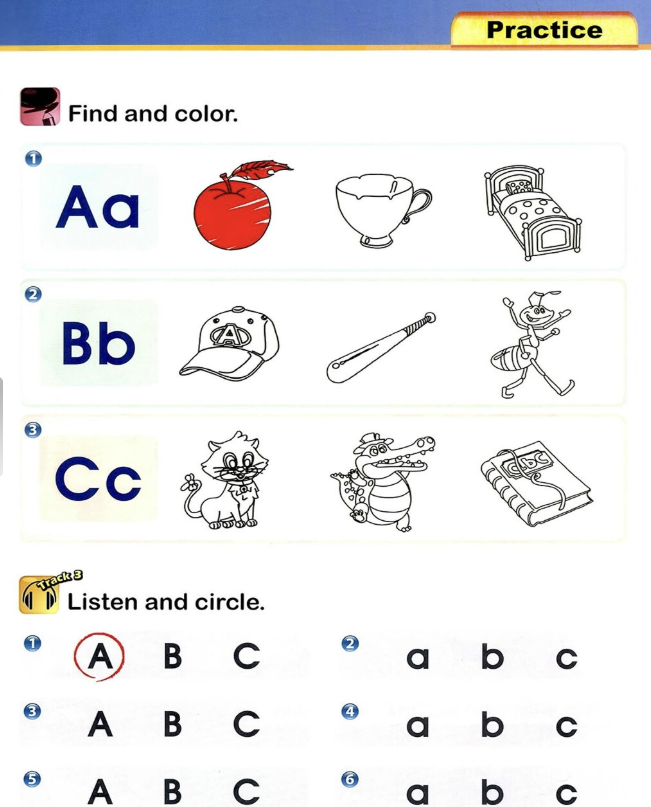 배운 단어들을 써보는 단계입니다. 왼쪽에 그림은 앞에서 배운 단어의 그림이라 배운 내용을 복습할 수 있습니다. 그리고 소리를 들으면서 대문자 소문자를 써봅니다.