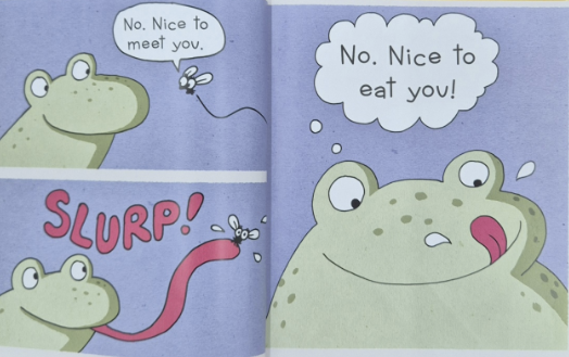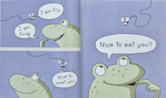 서로 인사를 나누는 프로그와 플라이입니다. 플라이가 "nice to meet you" 하자 프로그가 "nice to eat you"라고 대답합니다. meet-eat 라임을 확실히 익힐 수 있습니다