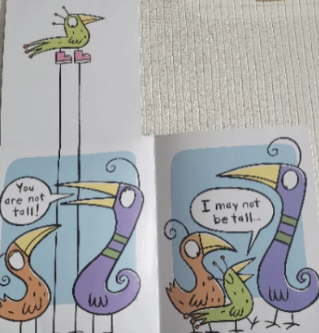 플랩을 넘기면서 크기, 높이, 위치 등 비교 개념을 배울 수 있는 책입니다. 작은 새 인 줄 알았는데, 플랩을 넘기니 큰 새가 되었네요. 보라색 새는 엄마, 초록색 새는 아이 등 역할을 나누어서 대화를 해보세요. 아웃풋은 인풋을 기반으로 한 연습과정입니다. 인풋을 한 책을 바탕으로 아웃풋을 연습하시면 효과적입니다.