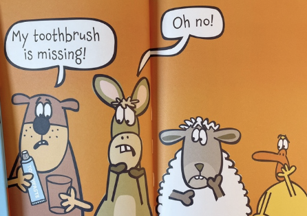 양치질을 해야 하는 데 칫솔을 잃어버린 도그를 위해 친구들이 칫솔을 찾아 나섭니다. 칫솔에 대해 질문하는 전개방식이 스무고개 퀴즈 같습니다. 이런 전개 상황을 보고 아이들이 무의식적으로 묘사하는 표현을 익히게 됩니다.