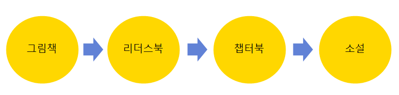 영유아부터 유아까지는 주로 그림책을 봅니다. 유치원생과 초등 1학년생은 그림책도 보지만 읽기 연습용으로 리더스북을 읽습니다. 초등저학년생은 얇은 문고판 형태의 챕터북을 읽고 초등 고학년부터는 소설을 읽습니다.