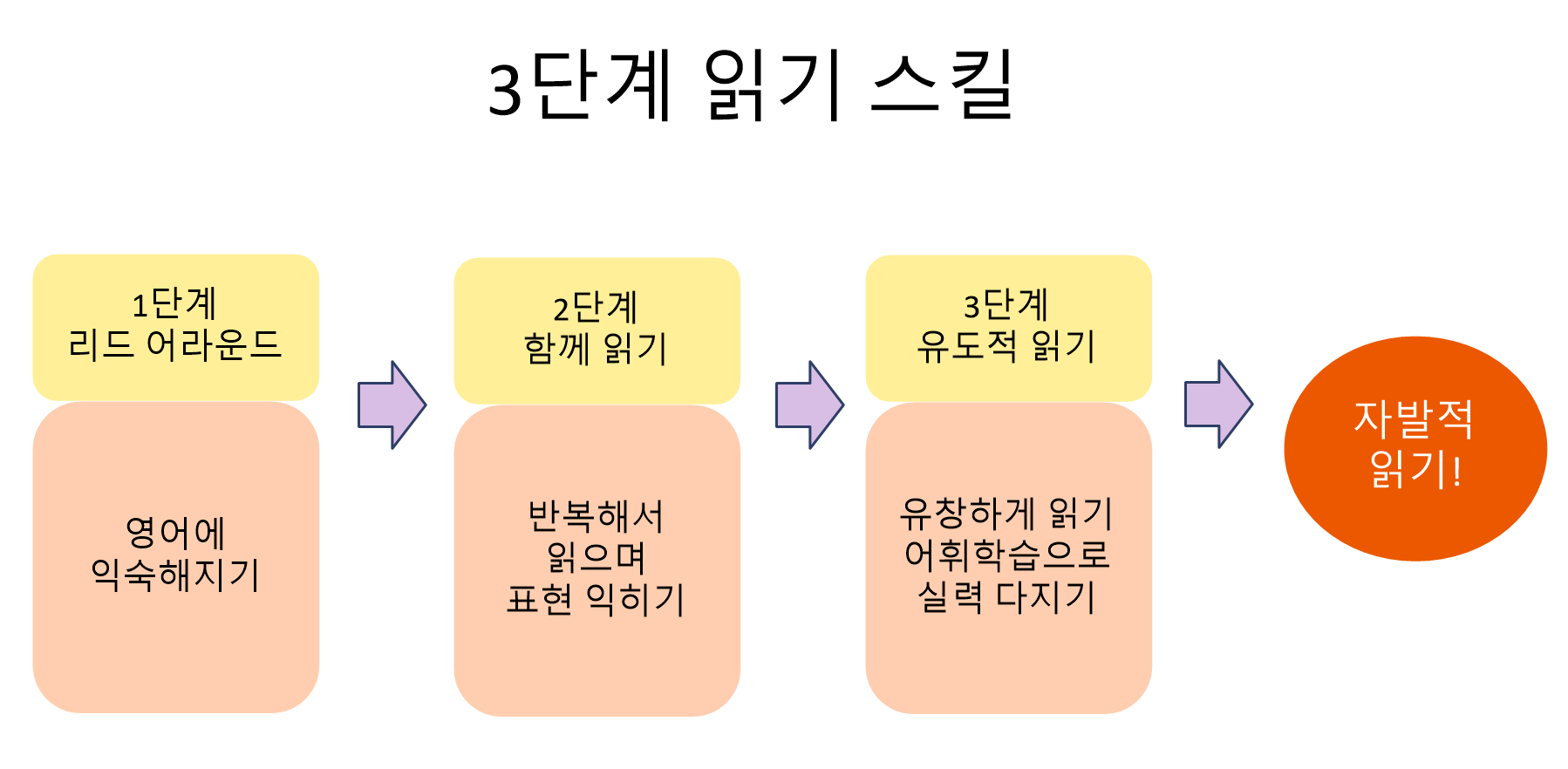 리드어라우드 단계는 그림과 글이 일채해서 내용을 쉽게 이해할 수 있고 반복되는 문장안에서 해당 주제의 어휘를 다양하게 익힐 수 있는 책을 선정해야 합니다. 많은 책을 읽어 주어 아이가 영어의 소리와 문장 구조를 익히고 기본 어휘를 알아가는 데 초점을 두는 과정입니다. 2,3 단계를 넘어가더라도 리드어라운드 과정을 꾸준히 해주는 것이 영어 학습에 효과적 입니다.