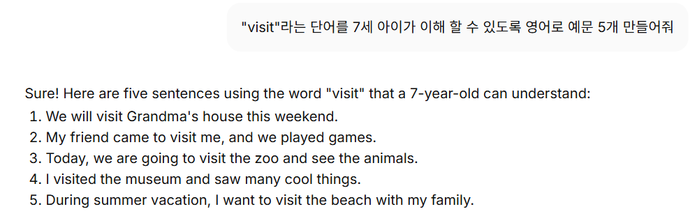 여기에 있는 단어들을 외우라고 시키는 것이 아닙니다. 알지 못하는 단어가 너무 많으면 뒤에 있는 내용을 이해하기 너무 힘듭니다. 2개 이상 모른다고 하면 단계를 낮춰서 진행해야 합니다. 모르는 단어는 예문을 통해 어떤 의미인지 유추해 보도록 가이드해 줍니다. Chat GPT에게 해당 단어가 들어간 예문 5개를 뽑아달라고 요청해 봅니다.