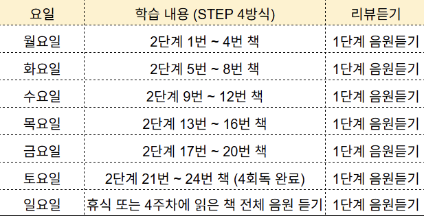 리뷰 듣기 : 한 단계가 끝나면 다음 단계 학습을 진행하면서, 이전 단계를 '리뷰 듣기'로 꾸준히 반복해 주세요. 예를 들어 3단계 4 회독을 진행할 때는 1~2단계를 리뷰 듣기로 복습하는 것입니다.