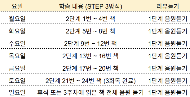 리뷰 듣기 : 한 단계가 끝나면 다음 단계 학습을 진행하면서, 이전 단계를 '리뷰 듣기'로 꾸준히 반복해 주세요. 예를 들어 3단계 4 회독을 진행할 때는 1~2단계를 리뷰 듣기로 복습하는 것입니다.