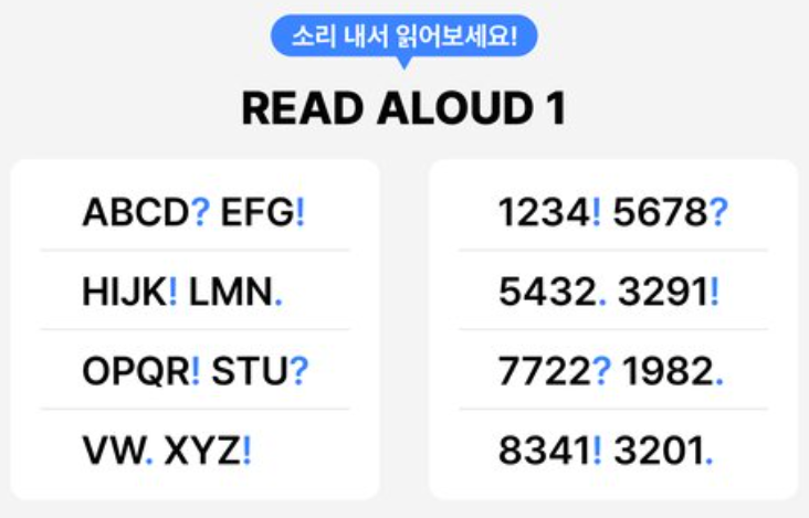 첫걸음은 문장 부호의 느낌을 살려서 읽어 봅니다. 먼저 아이가 술술 잘 읽을 수 있는 알파벳과 숫자를 이용해 물음표, 느낌표, 마침표의 느낌을 살려서 읽기 연습을 해 봅니다.