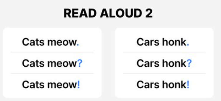 아래의 이미지를 보며 문장부호에 따라 각각 질문하고, 강조하고, 끝이 난 듯한 뉘앙스를 살려서 읽어 보도록 합니다.