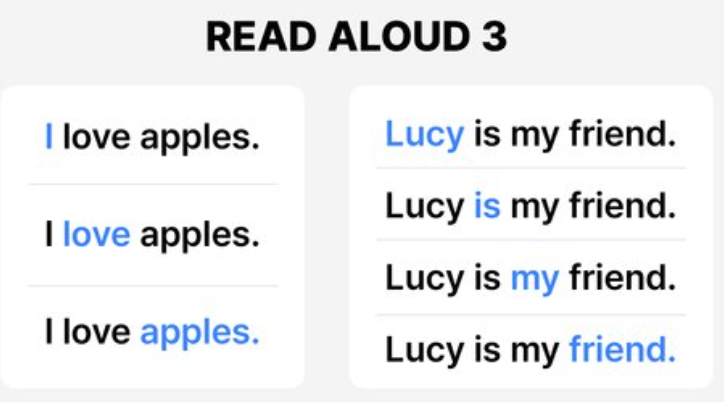 마지막으로 단어마다 강세를 주어 읽는 연습을 합니다. 이 과정에서 아이는 어떤 단어를 강조해 읽느냐에 따라 문장의 의미가 달라질 수 있다는 것을 배울 수 있습니다. 아래 이미지에서 파란 글씨로 쓰인 단어를 강하게 올려 읽어 보게 합니다.