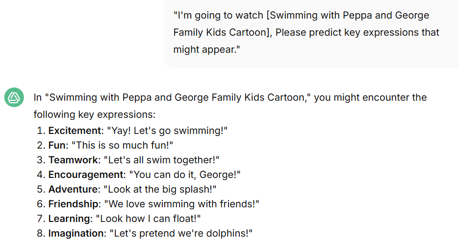 표현 확장하기 ChatGPT 프롬프트 : "I watched [Swimming with Peppa and George Family Kids Cartoon], Please make daily conversation for 5-years-old and mom"