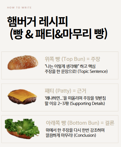 • Bottom Bun (아래쪽 빵) = Closing Sentence (마무리 문장): 햄버거가 무너지지 않게 받쳐주듯, "그래서 나는 ~라고 생각한다"라며 내용을 정리합니다.