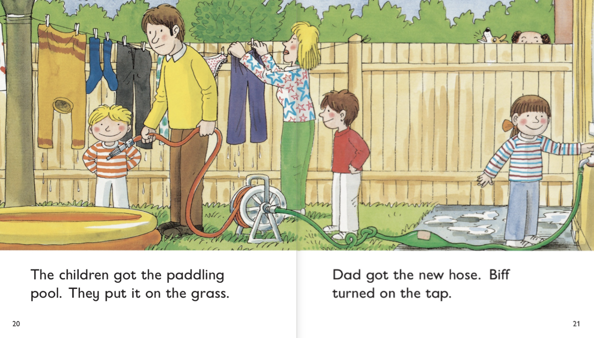 청킹: 문장이 길어지면 의미 단위로 끊어 읽어줍니다. 엄마가 "The children / got the paddling pool." 하고 끊어 읽으면 아이도 그 덩어리대로 따라 읽게 유도합니다. "The children " (쉬고) " got the paddling pool."