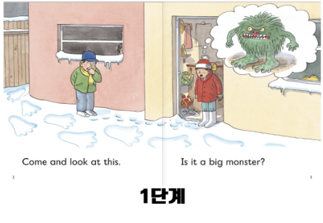 (다른 페이지) "이 발자국을 따라가면 뭐가 나올까? 혹시... 무서운 괴물? 아니면 엄청 큰 강아지?"