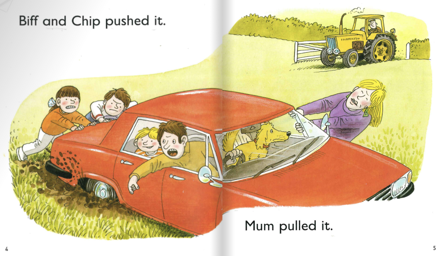 (아이가 자동차를 'push' 하는 그림을 보며) "와! 이 아이가 자동차를 밀고 있네! Push! 우리도 같이 미는 흉내 내볼까? Push! Push!" (아이와 함께 몸을 앞으로 기울이며 미는 동작을 취합니다.)