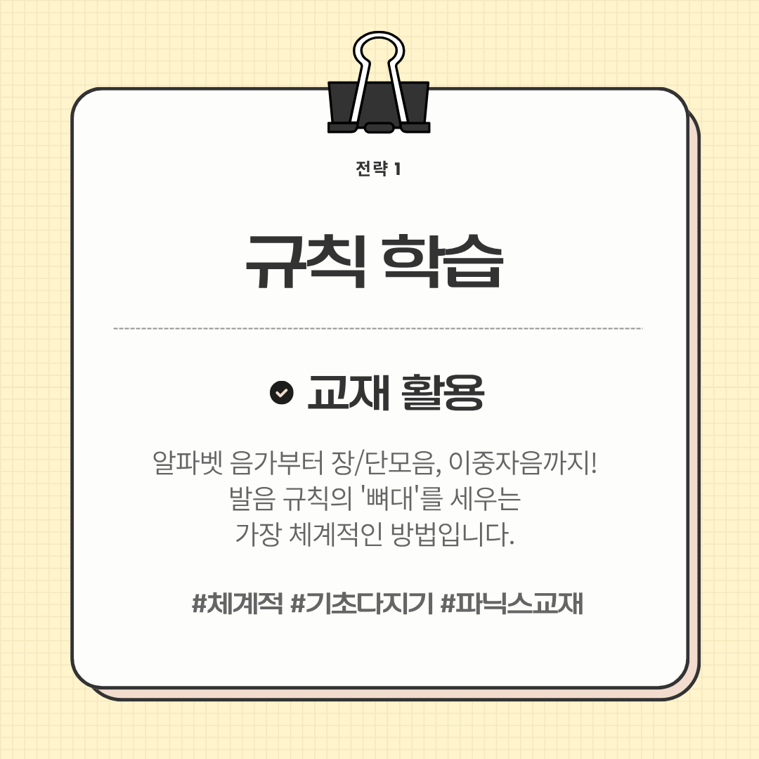 이 방법은 발음 규칙을 먼저 배우고 단어에 적용하는, 한국 아이들에게 가장 익숙하고 체계적인 방법입니다. 알파벳 음가부터 장/단모음, 이중자음까지! 발음 규칙의 '뼈대'를 세우는 가장 체계적인 방법입니다. 주로 기초 단계에서 개념을 잡고 뼈대를 튼튼히 하는 데 아주 효과적입니다.